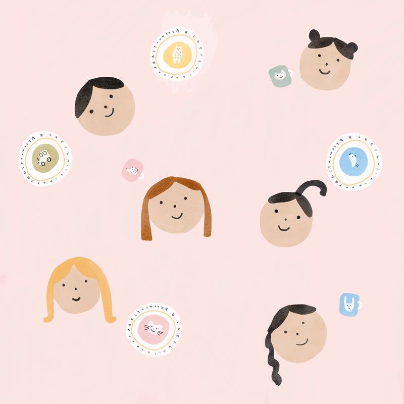 Personalizēti trauki bērniem, kuriem uz malas sasēdusi burtiņu rinda.